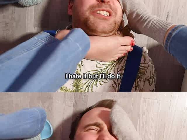 Princess Kirstin let her white stocking feet lick and kiss by her slave Bobby.