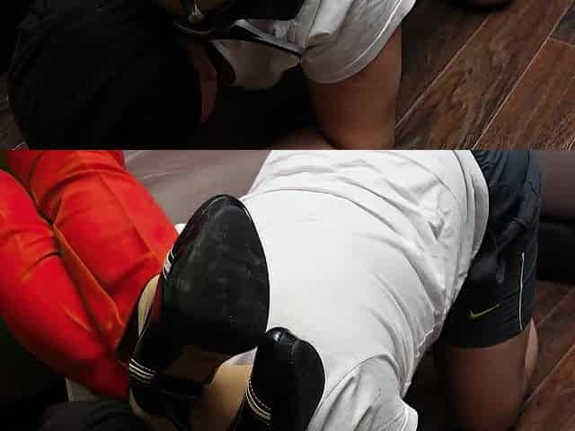 headmistress nylon feet shoes puts feet on serf collar chained femdom