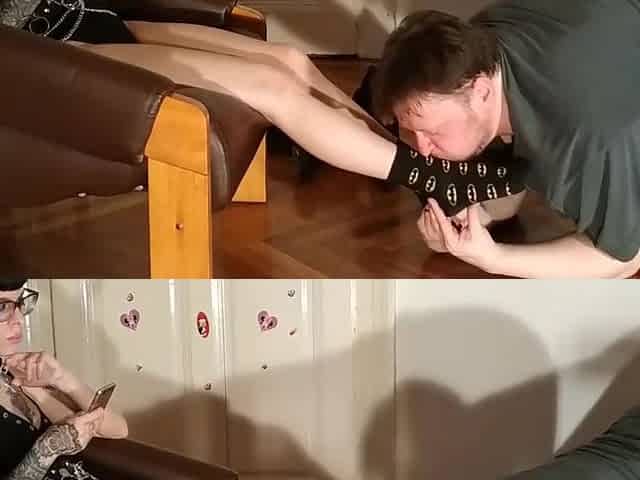 Three milf stockings feet worship by a slave