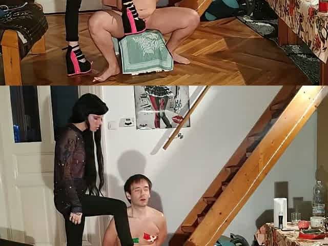 Mistress Karolina In A Red Latex Jumpsuit Dominates And Humiliates A Guy Slave