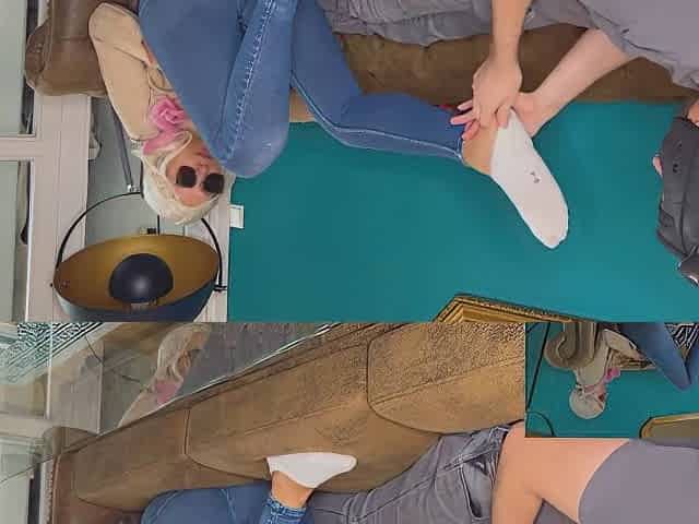 A girl borrows her friend's foot fetish slave