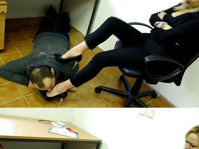 Femdom boss turns thief into shoe licking foot slave