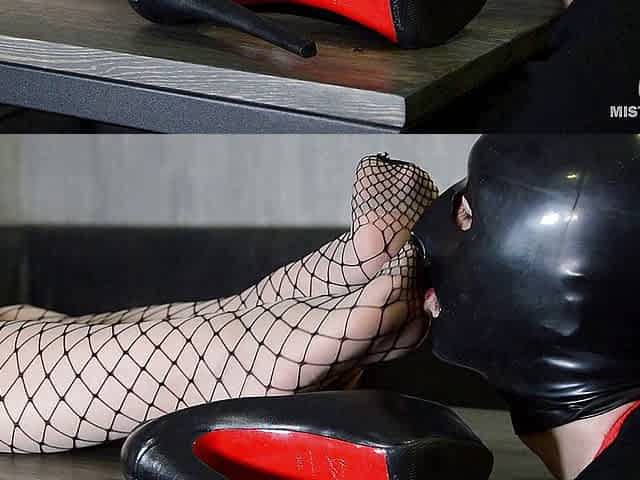 Slave is worshipping Mistress legs in fishnets and high heels