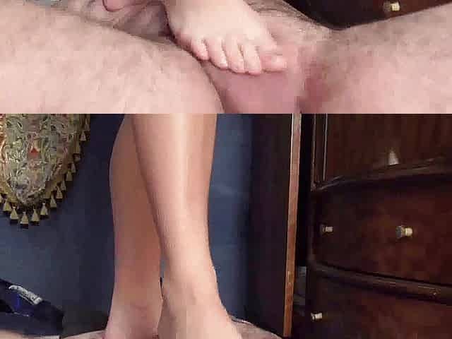 Hot Milf gives silky nylon foot wank until sissy slave cums on sexy feet