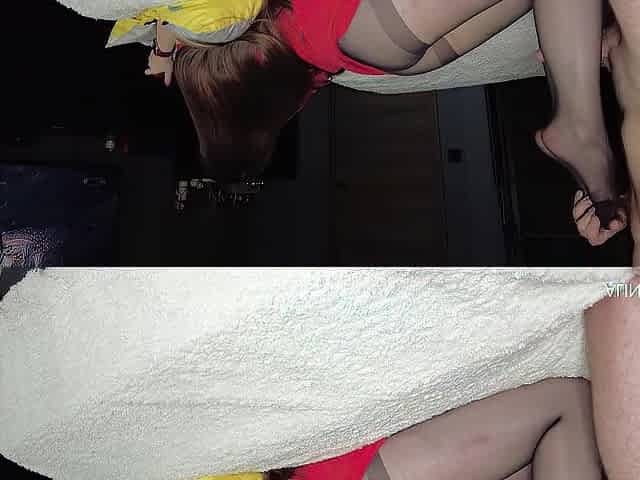 Sexy mature stepmom in stockings gives her stepson a footjob