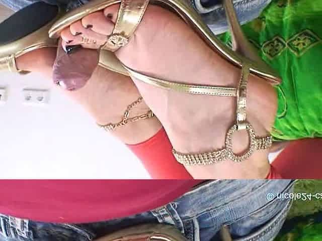I'll take off my red heels and wank your massive knob with my feet and hands!