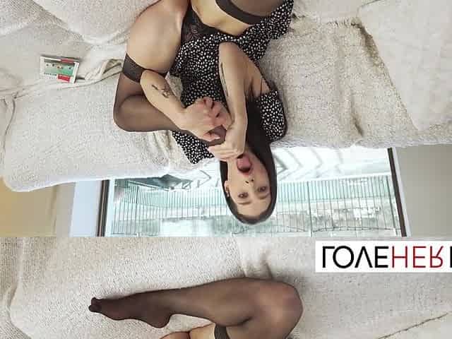 Goddess indulges in foot fetish and deepthroat, allowing a guy to cum on her stockings-clad legs - Homemade POV Series Part 1