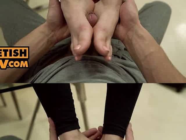 Fishnet-clad amateur LeLovelyCouple gives a rough footjob and gets a sticky cumshot on her ass