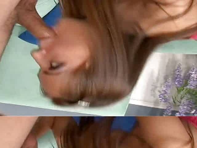 Pretty Japanese babe plays with a guy and strokes his hairy cock on the floor