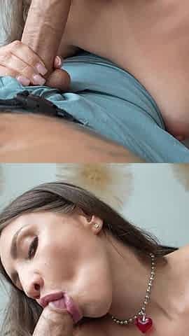 Morning sex, 2 excited gals wakes up a dude sucking him, then riding his penis and tongue, cumkiss
