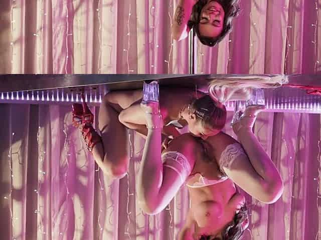 Blonde and brunette lesbians stripping and making out