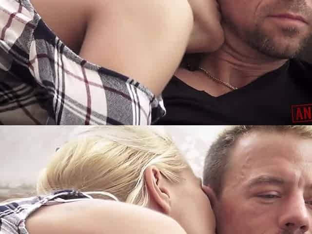 Slutty teen climbs on her stepfather and starts to kiss him and feed him her boob and rides on his weenie hard