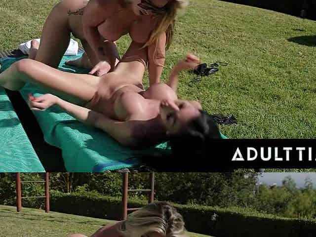 ADULT TIME - Big Titty Babe Kayla Paige Scissors With MILF Bestie Nikita Reznikova In The Sun!