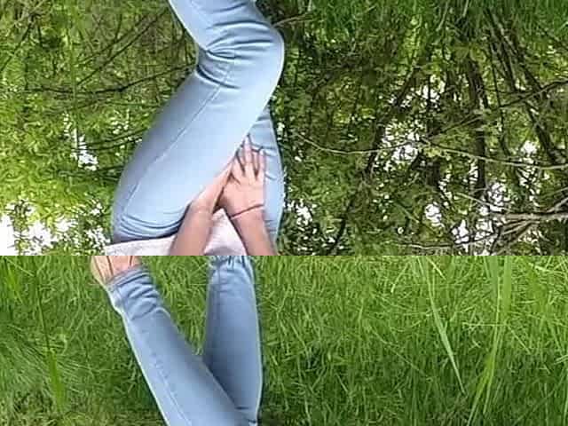 Desperate Skinny Girl in Jeans Trying to Hold Her Pee in the Forest