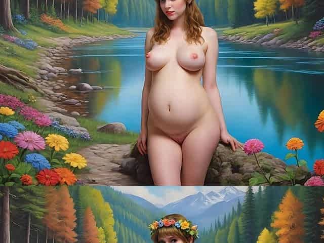 Nude Elf Pregnant Women Posing Near River in the Forest