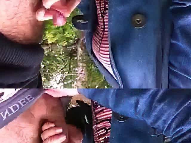 Flash Doggy standing and deepthroating in the forest park. Big clit, saggy tits
