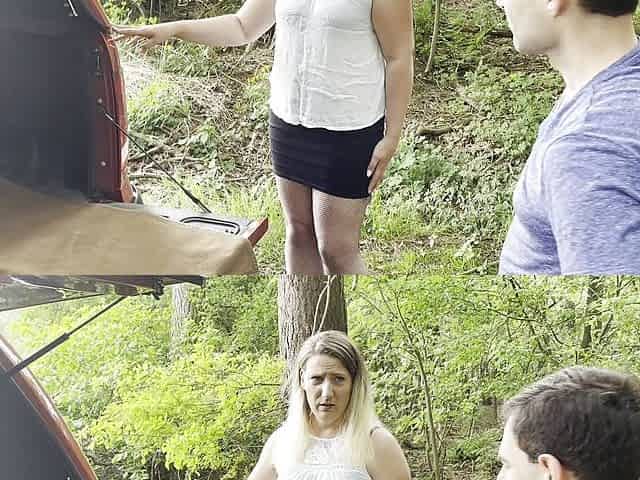 Dirty mature blonde blows a guy and gets fucked in the woods