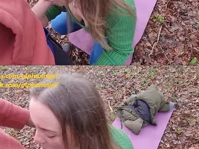 Russian horny teen swallowing cum while walking in the woods with her bf