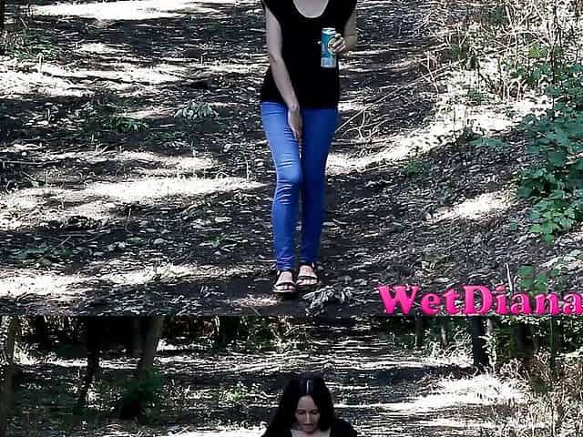 Desperate girl in the woods finds the perfect spot to pee in her jeens