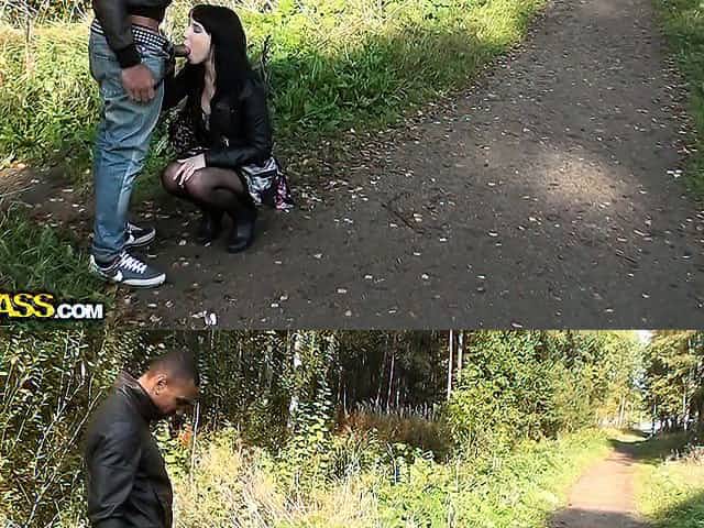 In the woods, she drops to her knees and wraps her lips around two big dicks