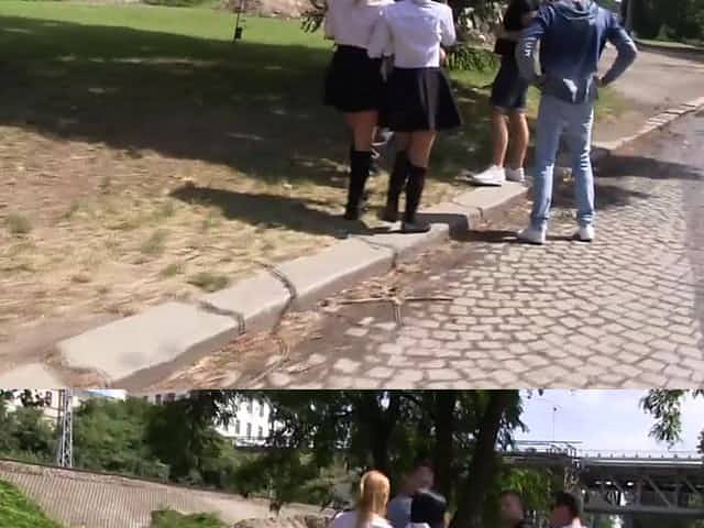 Teen slut in a blouse and skirt meets two guys in the woods for sex