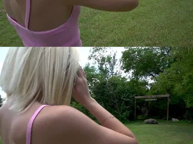 Amber Deluca rubs her huge clit and wet pussy on a park bench