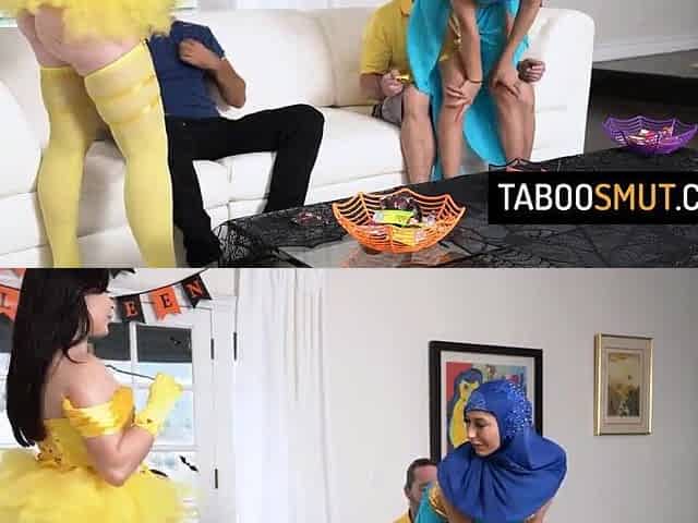 Cosplay teens takes their stepdads dicks as a threat for Halloween