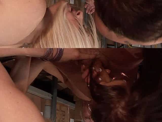 Two horny sluts having a foursome at the garage