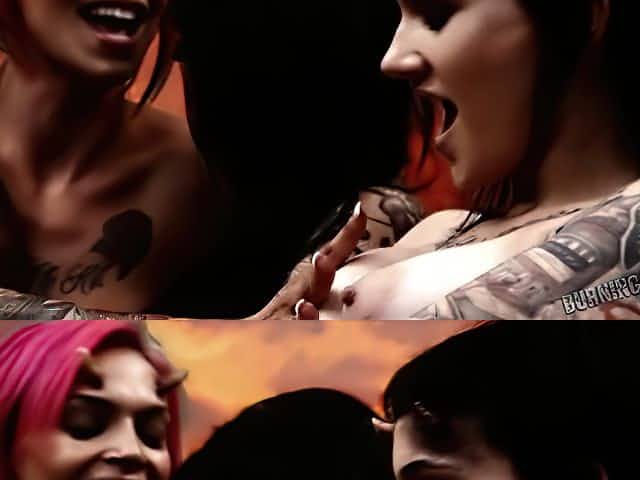Heavily inked punk cutie Leigh Raven and 2 other wild ladies present nasty 4 some sex