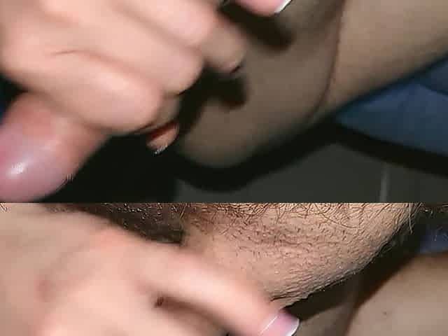 Giving an tugjob to my spouse and this guy cums on my lips. Close up