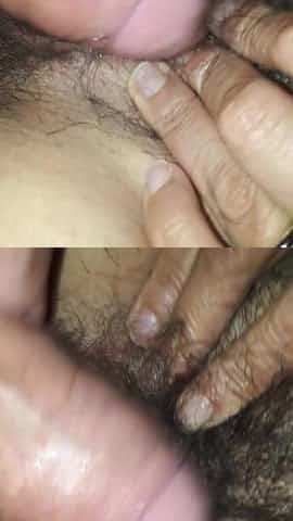 Play with my cock on her hairy wet pussy