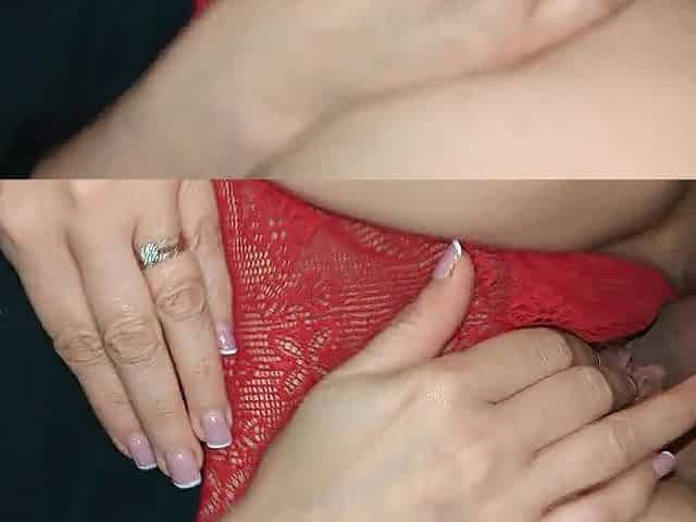 Mommy have a loud climax and daddy cum on her red lace pants