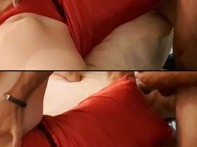 1766 (02) - French Slut in Red Satin Dress, Red Satin Thong, Stockings, High Heels, Blowjob, Fucking, Doggy Style, Rimming