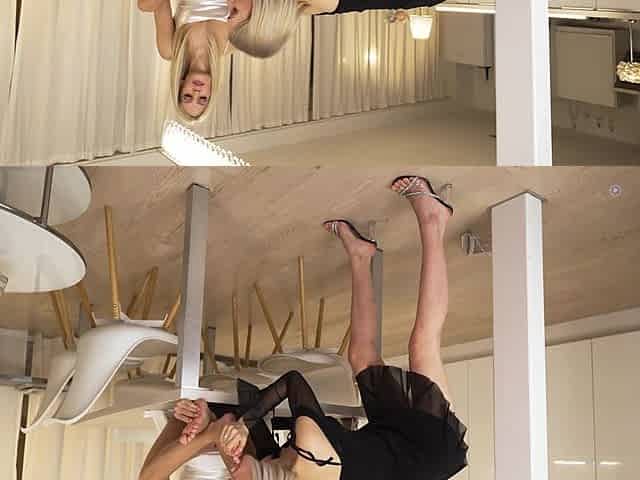 Girls make out in the kitchen before heading to the sofa for some steamy fun