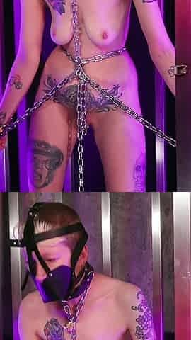Lezdom Gagged Slut Is Caged, Chained & Fucked with Fucking Machine