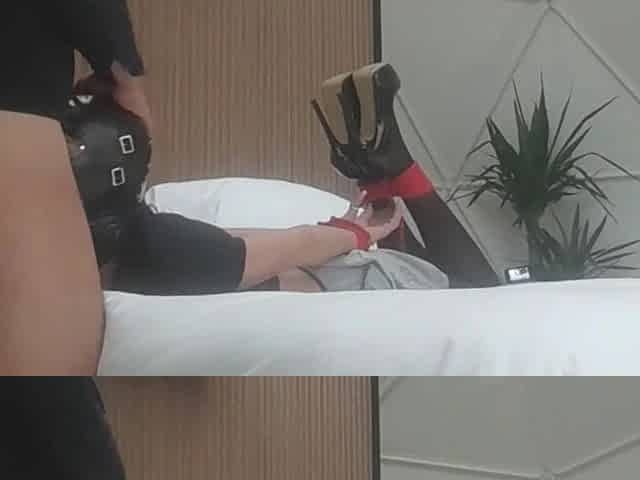 I'm fastened up in hot raiment and high heels, blindfolded and with a large ball gag on my throat