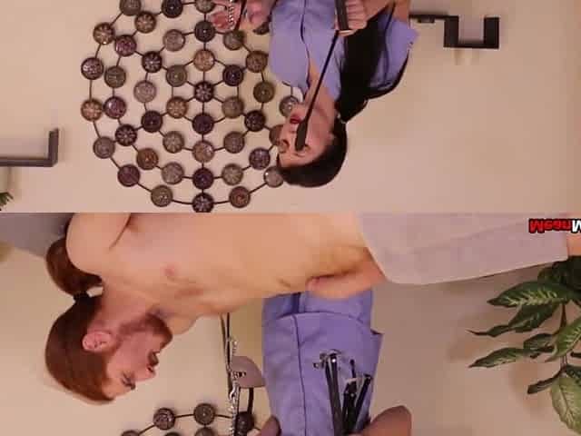 Omg! Sexy Brunette in Nurse Outfit Dominates Bound Man with Handjob in Clinic