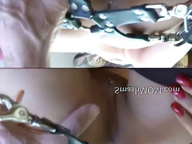 Gagged bdsm toying her super wet pussy
