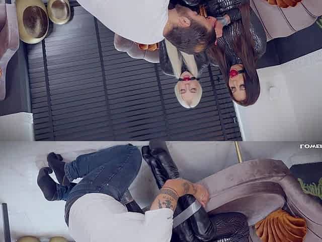 Two Beautiful Lesbian MILFs Gagged with Ball and Fucked by a Big Cock