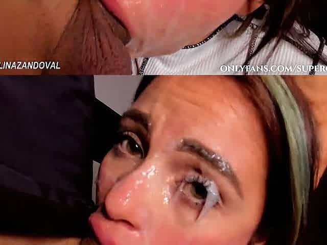 Swallowing cum and gagging in a tied up blowjob session