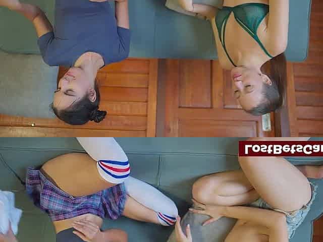 2 brunette hair lesbos are playing a undress game on the daybed