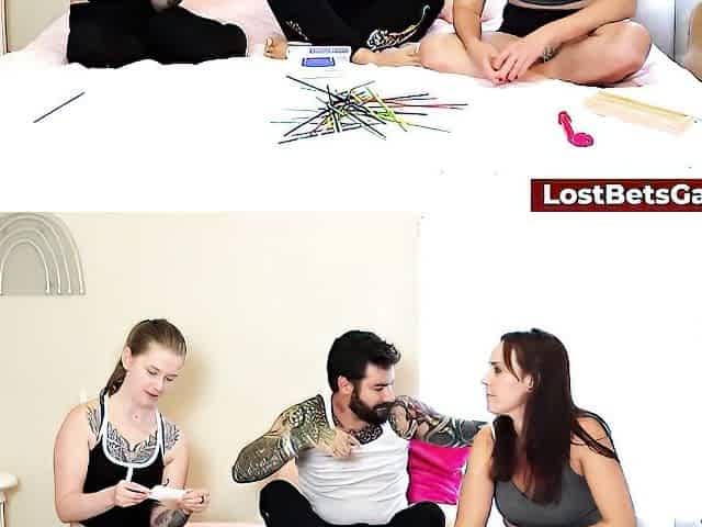 A naughty strip game of strip Jenga Draw among three hot lesbian friends
