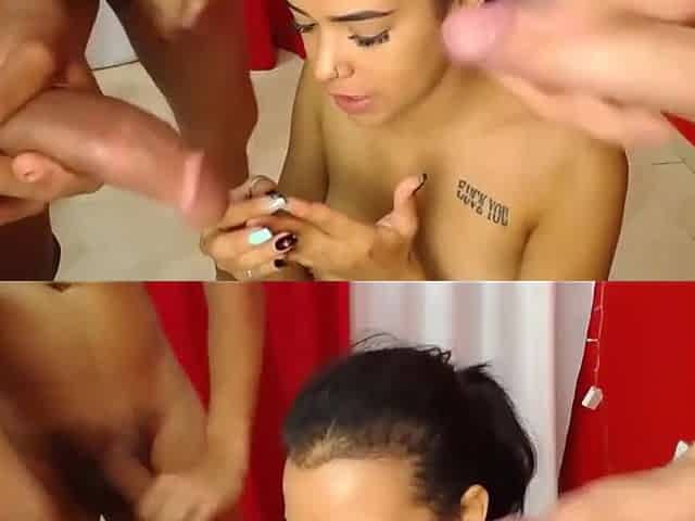 Little Slut Sucks Two Cocks in Gangbang While the Third Fucks Her