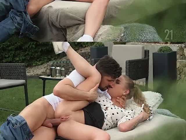 Kinuski is having anal sex in the backyard, in the centre of a glamorous day