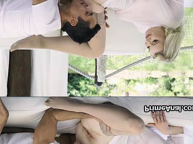 Slutty teen bitch Lena Paul rides a big cock in the backyard