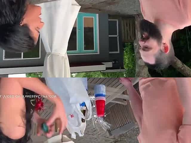 Blasting Her Booty With Biggest Bottles Outdoors