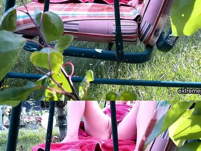 Hawt lean gal Freya masturbates her pink snatch in the garden