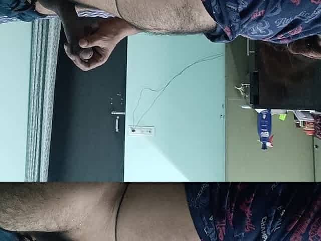 A Guy with a Massive Foreskin Spreads His Legs Wide on the Bed. He Pees in the Shower Room and Then Cums