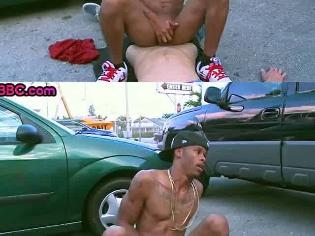 Real black tattooed thug fucked in public by white top on the street