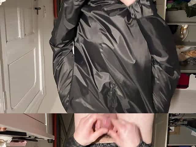 "Shiny nylon man in black nylon jacket"